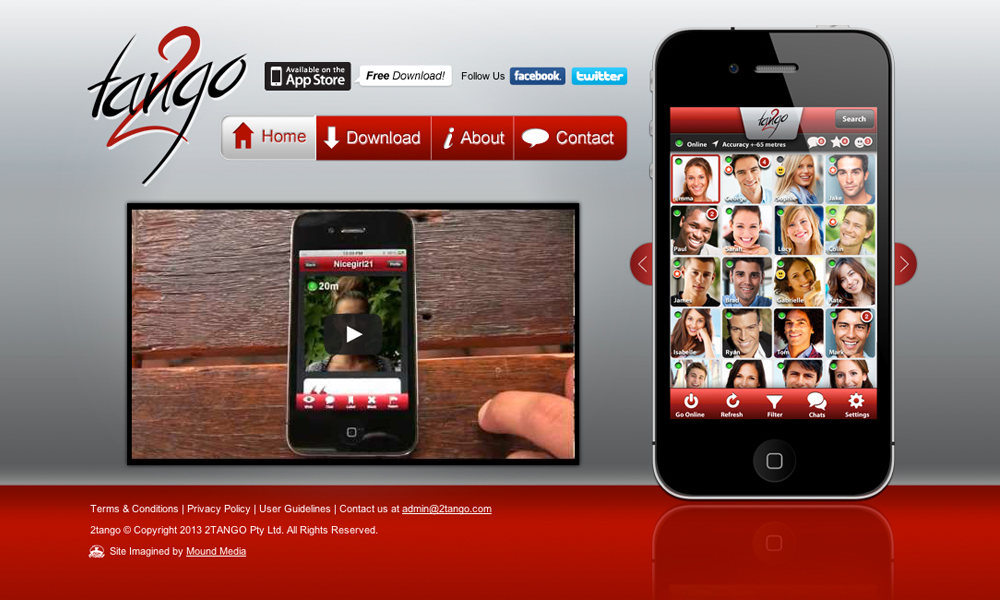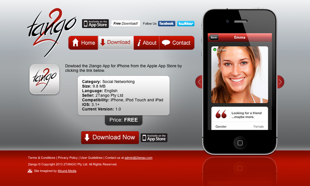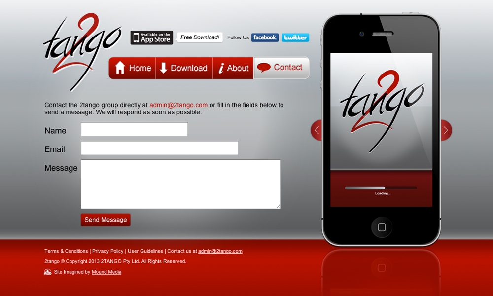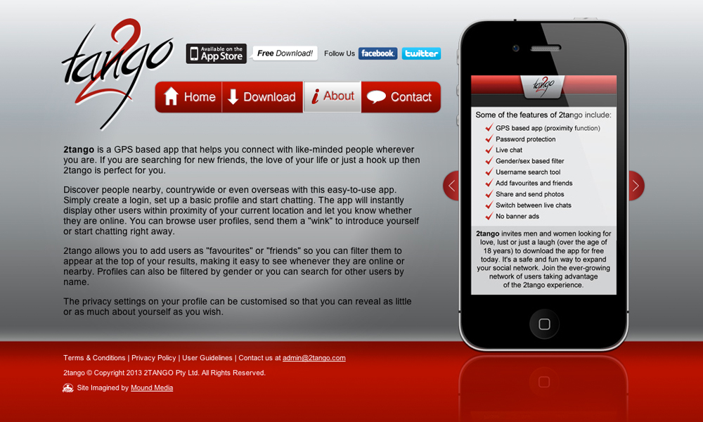 2Tango is a fun social networking iPhone app. This project involved the design and development of the official website for the App, including info and download links to the Apple App Store.