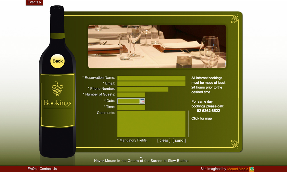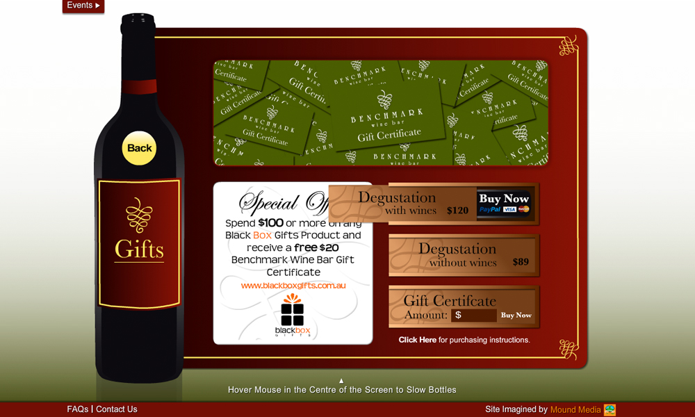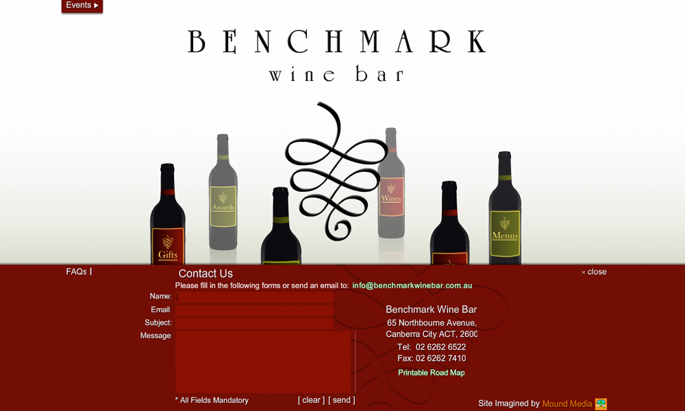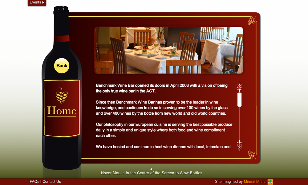 Benchmark Wine Bar is Canberra, Australia's premier wine bar. This project involved the design and development of a Flash website with a unique 3D bottle navigation system.