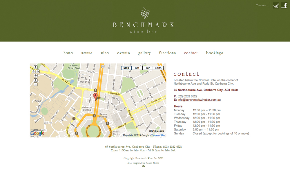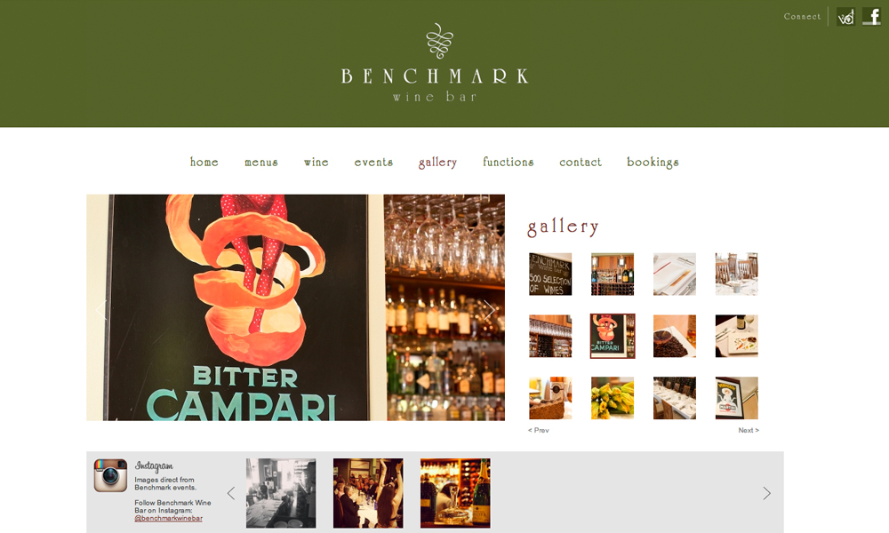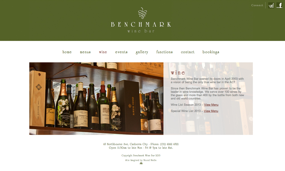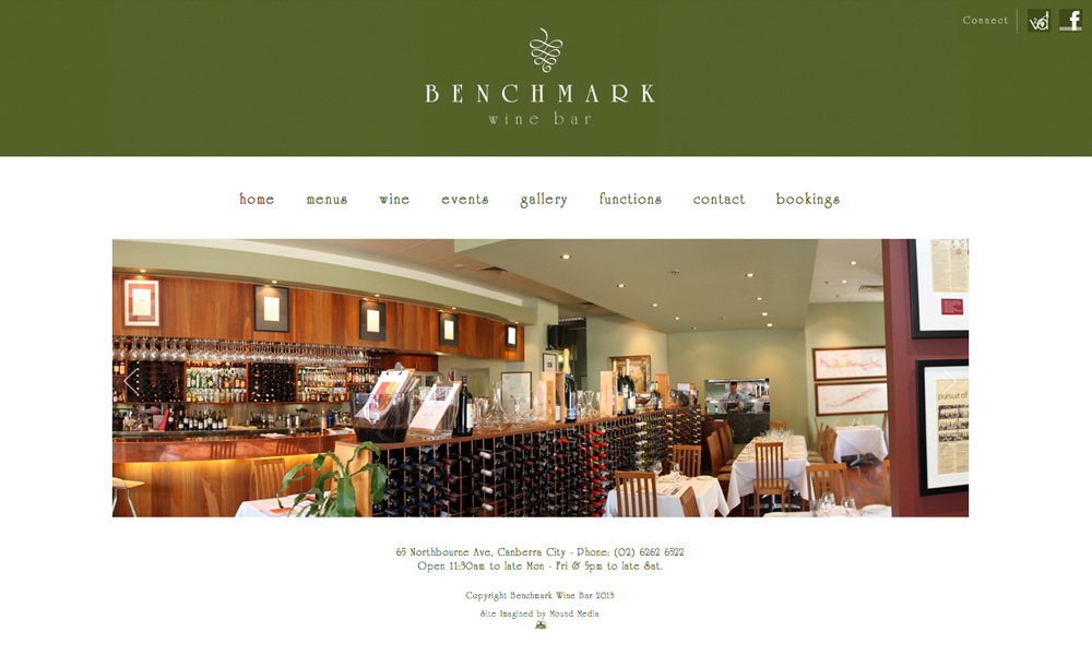Benchmark Wine Bar is Canberra, Australia's premier wine bar. This project involved the re-design and re-development of the website including events, galleries, menus and online booking systems.