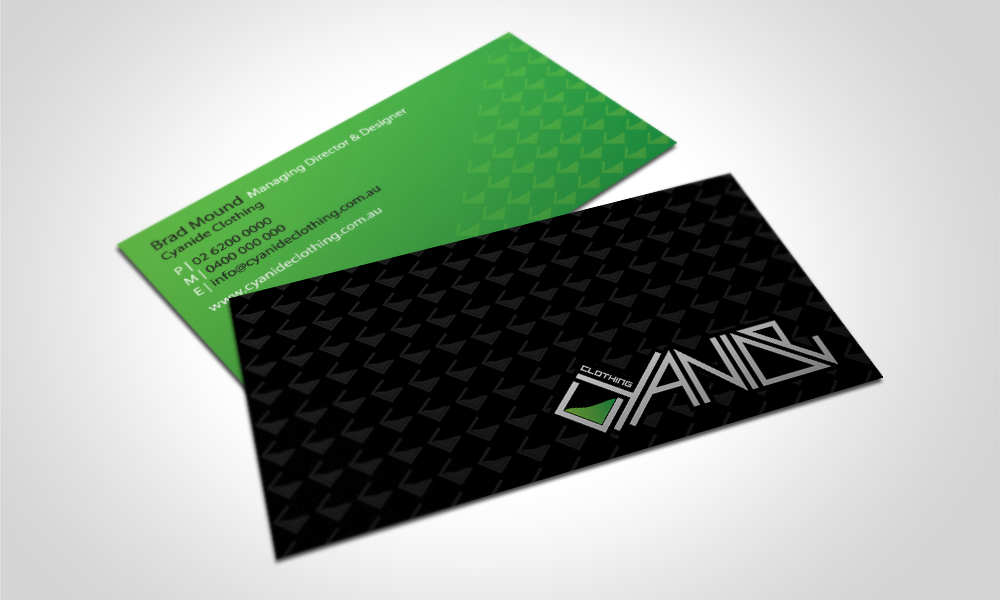 These business cards include a glossy pattern on the front and back to give them a textured feel. The green element of the logo is reflected by the green background on the reverse side of the card.