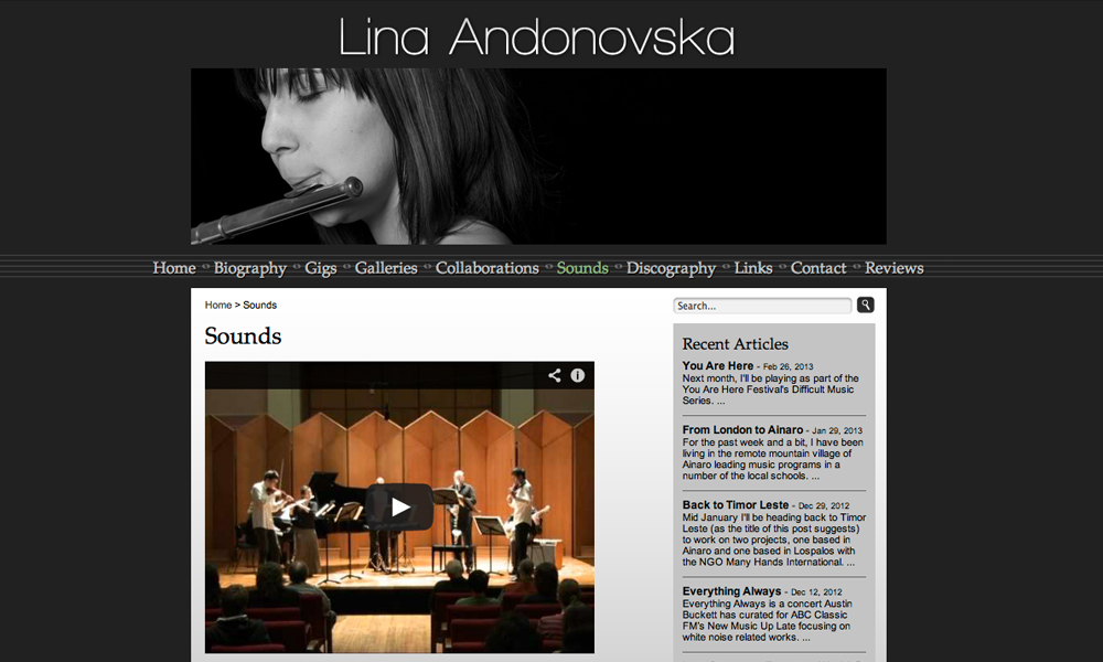 Lina Andonovska is one of Australia's best flautists. This project involved design and development of Lina's blog website with gig info, galleries, discography and reviews.