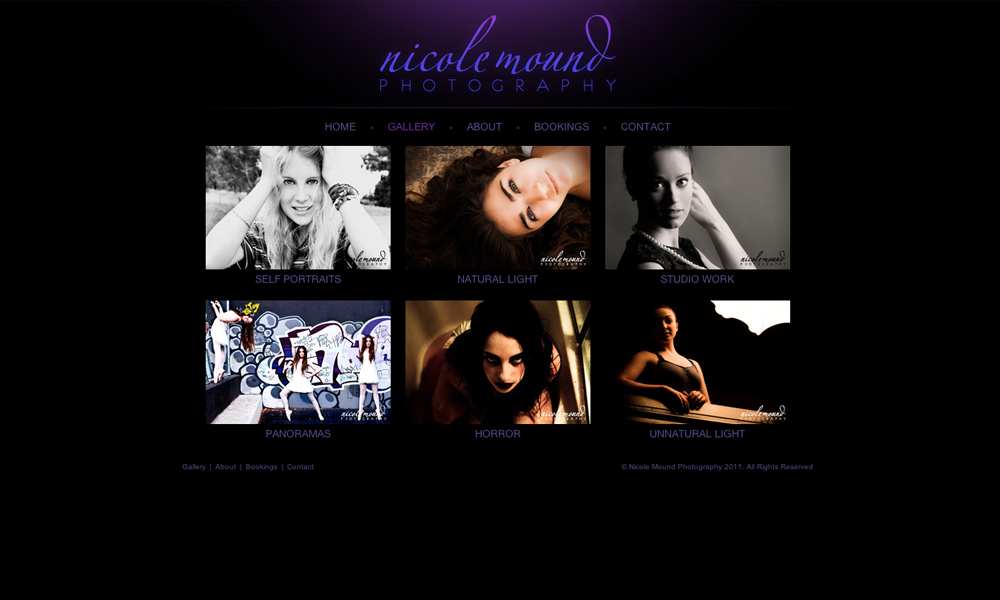 This project invloved the design and development of a portfolio website for Nicole Mound Photography showcasing her work. The development included a simple backend for updating content.
