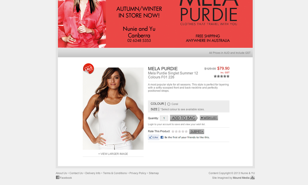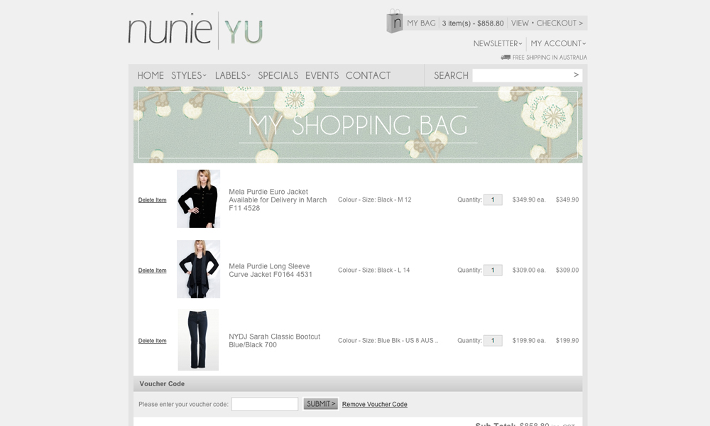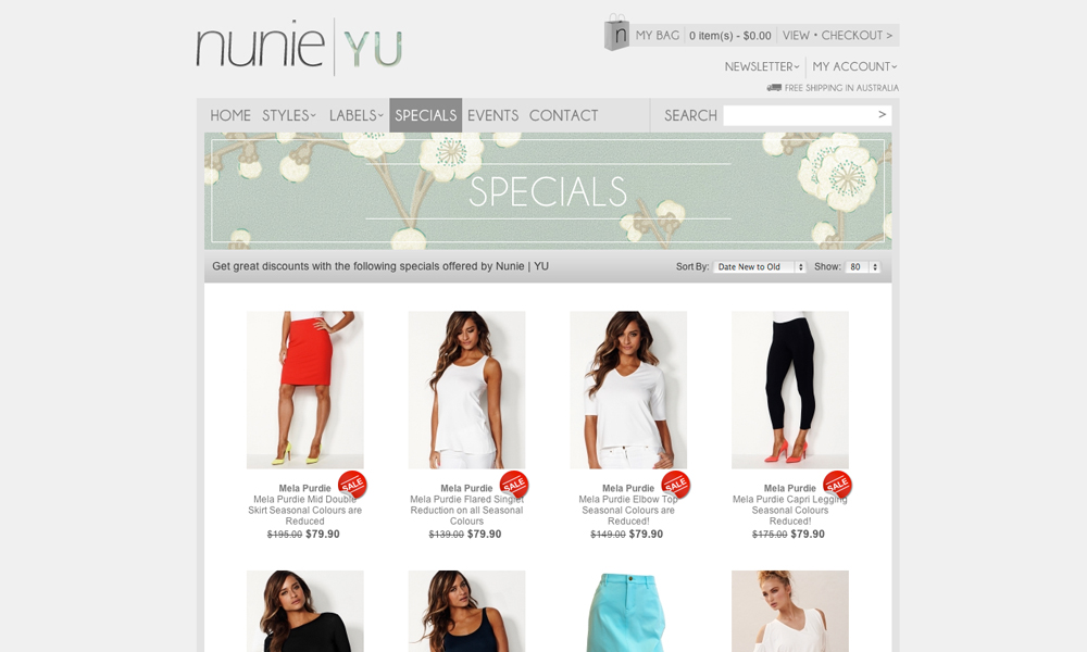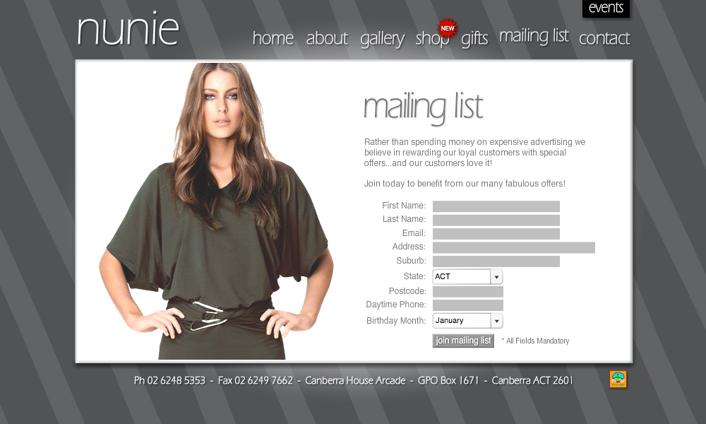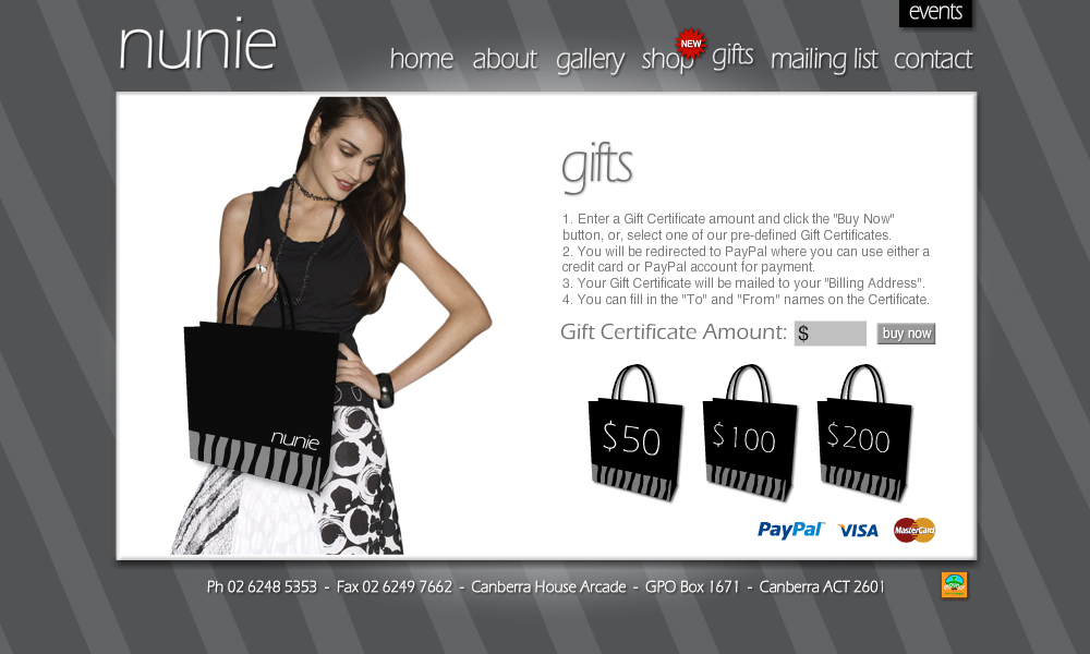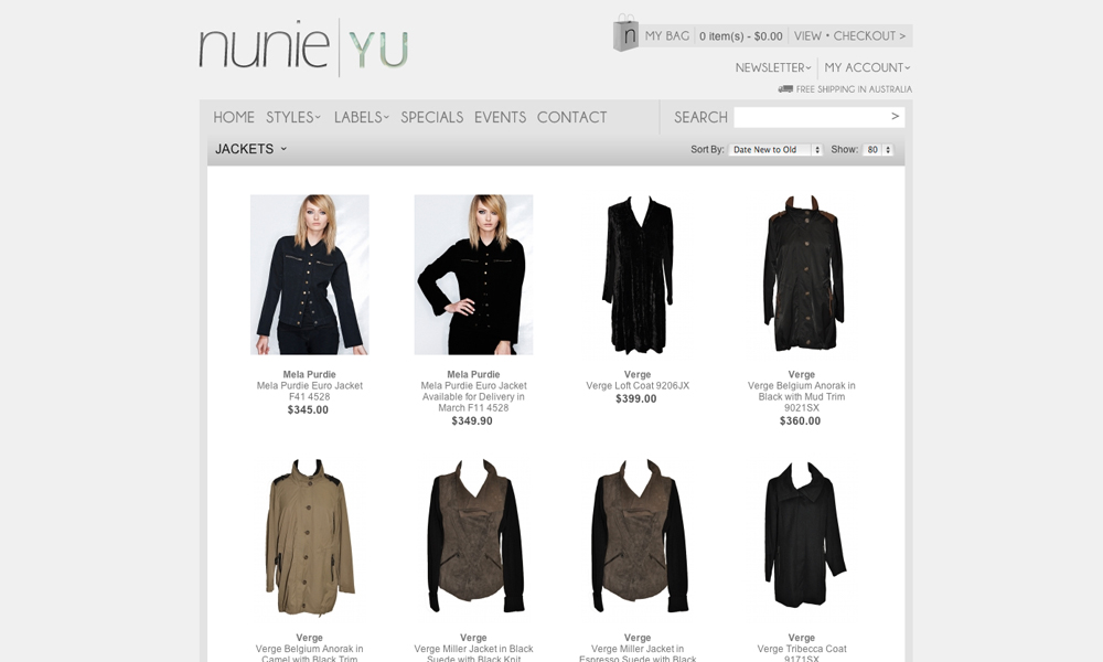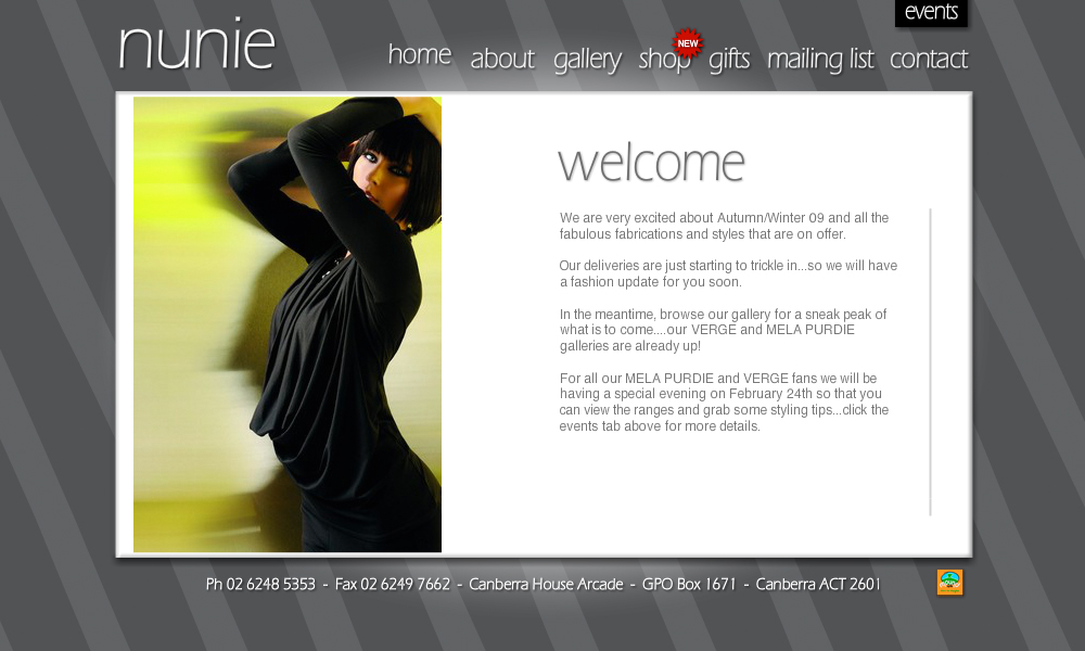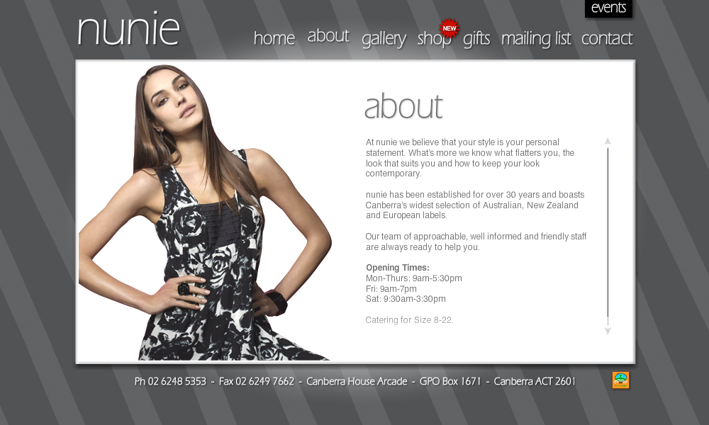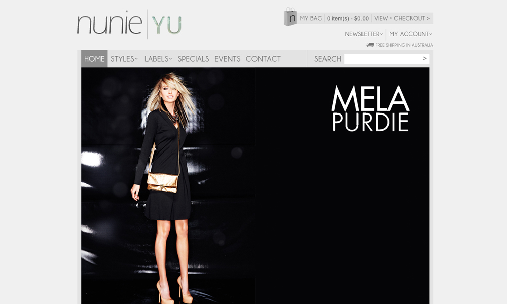 Nunie is boutique women's clothing store. This project involved the design and development of a Flash website including a gallery and gift voucher system. An eCommerce system was also built and integrated.