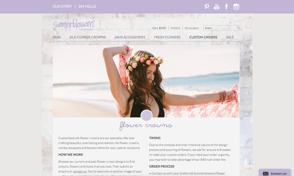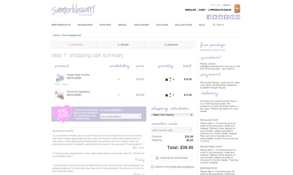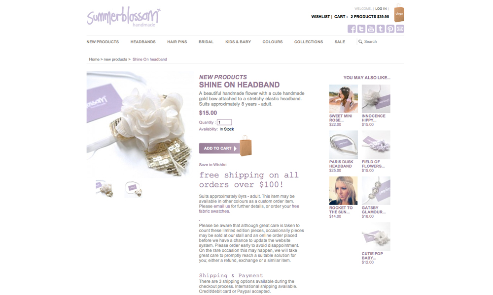 Summerblossom is an Australian brand that creates unique handmade hair accessories. This project involved updating various areas of the website, including the checkout, product info and newsletter.