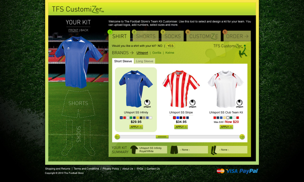 The Football Store is an eCommerce site that sells soccer jerseys, equipment and team strips. This project involved the full design and development of the website including a unique kit customiser.