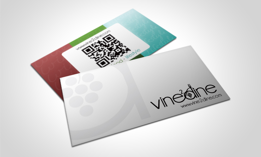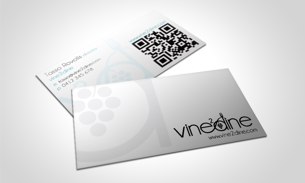 These business cards include a glossy symbol on the front and a custom QR code on the back pointing to the Vine2Dine website.