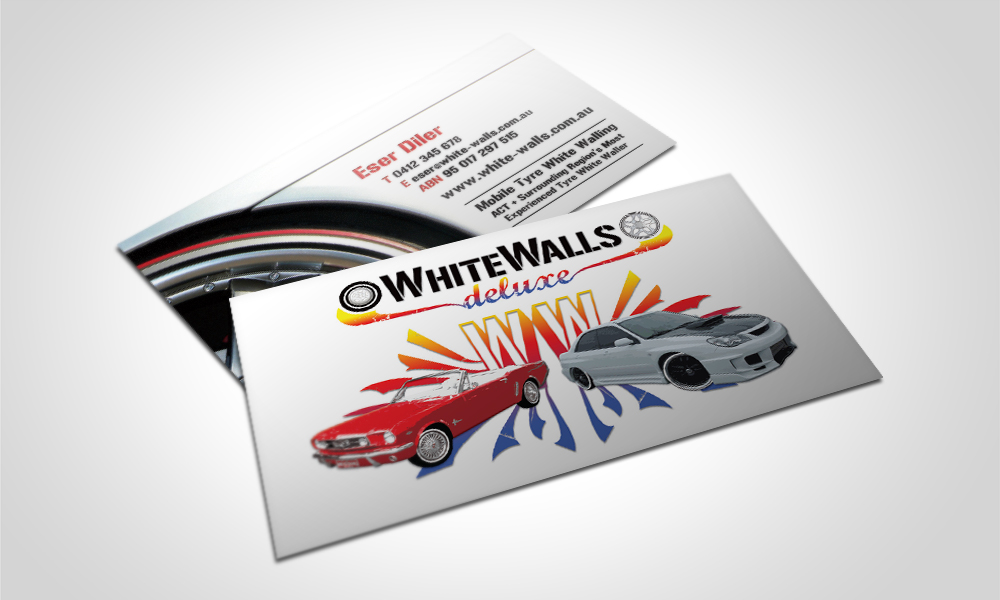 These business cards were designed around the WhiteWalls Deluxe mural with a feature image of a whitewalled tyre on the back of the cards to illustrate the services provided by the business.